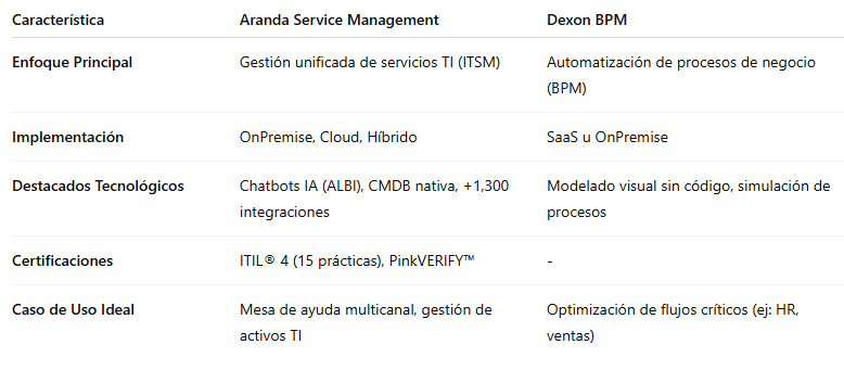 Expertos en despliegue de Aranda Service Management y Dexon BPM para optimizar mesas de servicio, gestión de activos y flujos de trabajo, con integraciones ágiles y alineación a estándares ITIL® y MINTIC .
